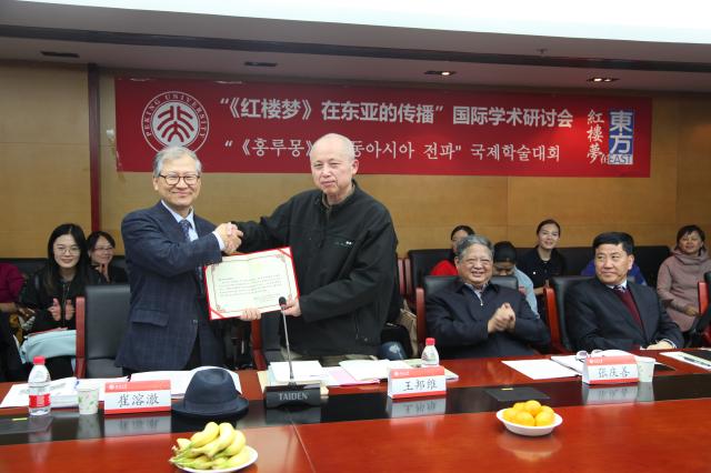 接下来由北京大学东方文学研究中心主任王邦维教授向崔溶澈教授颁发了“《红楼梦》在东亚的传播”课题负责人聘书。